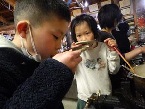 一年の暮らしは、こどもたちでつくっていくので、朝ごはんも5時半に起きてこどもたちで作ります。眠い目をこすりながら、みんなが美味しい!と感じられる味付けを目指して、入念に味付けを進めます。さて、出来栄えはどうかな?