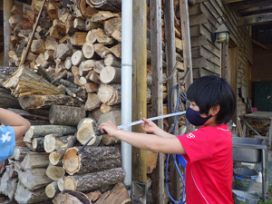 春は薪作業の季節です。薪作業前の現状把握は肝心です。「だいだらぼっちには、あとどれくらい薪が残っているのかな?」と、定規を使って一生懸命に調べているらーらです。