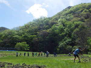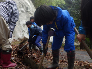 泰阜村の一員として、道路愛護(道路掃除)に参加しました。溝にたくさん溜まった落ち葉を村の人と協力してかきだしていきます。慣れない農具を使う作業だけれど、一生懸命働くなっちゃんです。