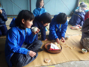 道路をきれいにした後は、村の人のお家でお茶をいただいてひと休み。一生懸命働いて疲れた体に、温かいおもてなしが沁み渡ります。いつも見守ってくれる村の人がいるからこどもたちも安心して活動できるのです。