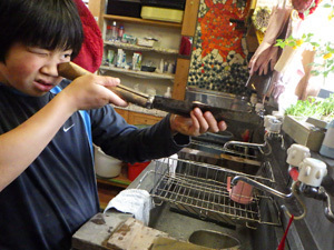 ものづくりの先生のギックに教えてもらいながら、自分のナタを集中して研ぐらーらです。ものづくりに使う道具を自分の手でメンテナンスすることも、だいだらぼっちで大切な仕事の一つです。
