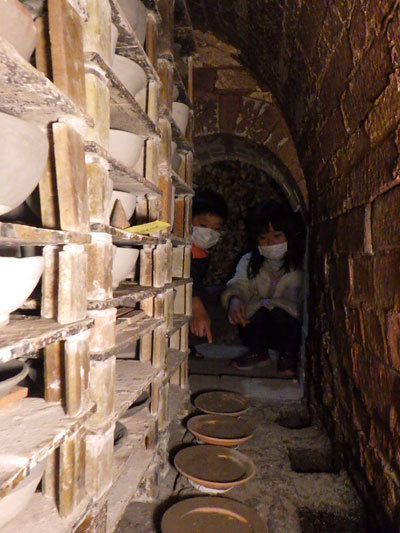 窯詰めも無事終わりました。最後に作品が詰まった窯の中を確認します。窯を焚いている最中はゆっくりを見ることができないため、どんな風に詰まっているのか確認します。
