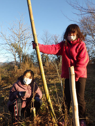 答えは、スナップエンドウの支柱に使う竹でした!ちょうどいい長さに竹を切って、葉を落として…来週村の農家さんに苗をいただくのでその準備をしました!