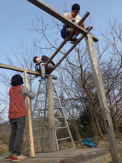 終わりに向けての作業が進んでいます。ニコルとKが苦労していた小屋も最後はきれいに解体します。“考えて実現する過程がおもしろい!”だから来年度のメンバーもゼロからチャレンジできるように片づけます。
