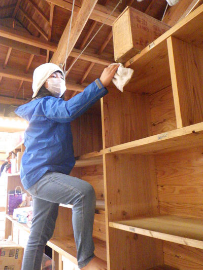 そして忘れてはいけない大仕事が“大掃除”です。広いだいだらぼっち隅々まで掃除します。いつもはたくさんの本が並んでいる本棚もこの機会に全部だしてきれいにしました。