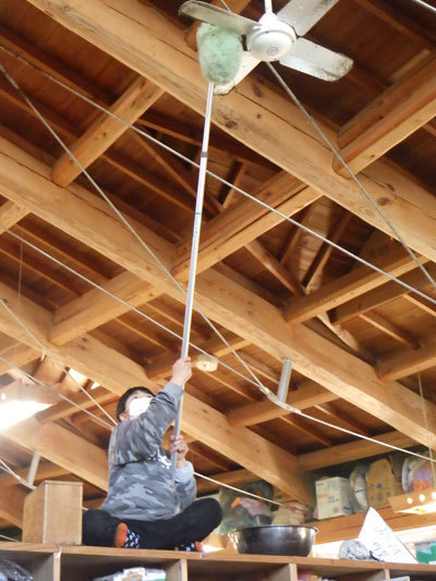 5mほどある天井のほこりもきれいに落とします。普段は絶対に届かない場所なので、びっしりほこりが積もっています。高い場所だから気をつけて落としてね。