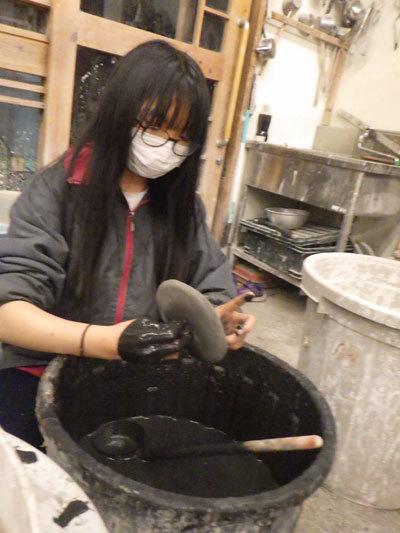 最後の窯焚きに向けて釉薬をかけています。ピコがかけているのは今年のワラの釉薬です。一年間の田んぼ作業の集大成です。