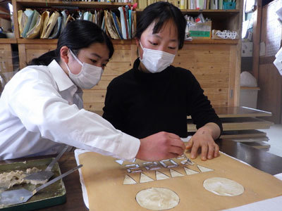 来週の引き継ぎ会に向けオリジナルのTシャツを藍染めします。まなみとふーみんはみんなで考えたデザインを出すために“糊付け”をしています。上手く染まるかな?