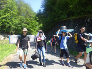 大きな重い荷物を持ちながら、約4㎞先の森を目指します。途中、日差しの暑さと荷物の重さと疲れで心折れそうに…しかし、荷物の持ち方を工夫したり、日陰に助けられたりしながら前に進みます!