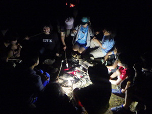 森の夜は、灯りが1つもなく真っ暗で静かです。そんな中で焚き火を囲み、焼きマシュマロ焼きタイムを満喫しました。静まり返る森には、焚き火の音とこどもたちの話し声が響いていました。
