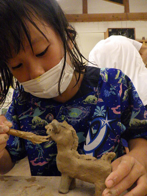 仲っちは、焼き物で十二支を作っています。“家族の干支は特別にしたい”という想いから、“白化粧”という手法に挑戦です。赤土で作った作品の上から白土の粘土を丁寧に塗っています。