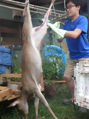 村の方が罠にかかった鹿を届けて下さいました。あだっちーは初めての鹿捌きに挑戦です。動物の皮をむく時、「あぁ、命を頂いているんだ」と命のありがたさを改めて感じました。