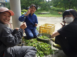 続いて、こちらは“生葉の藍”で草木染めです。「1つも残らず使おう!」と、春から育てていた藍の葉を丁寧に選別しました。完成が楽しみです!