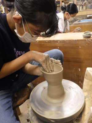すみれは2学期から電動ろくろに挑戦しています。少しの力の入れ具合で大きく形が変わってしまうので、息をするのを忘れるほど、指先に意識を集中して取り組みます。