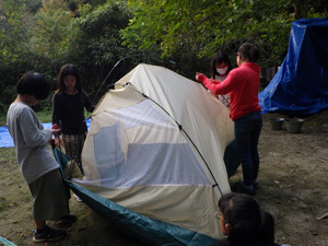 週末は、“時計のない”宿泊フリーキャンプを行いました。寝るスタイルも自由です。こちらは、テント泊チーム。「暗くなる前に寝床は整えておこう!」と、5人で協力してテントを立てていきます。