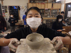 なつは電動ろくろの作品を手に満面の笑みです。それもそのはず、電動ろくろで作品を挽くのはとても難しいのです。何度も指先の感覚を研ぎ澄まし挑戦して、少しずつできるようになりました。てづくりとはまさに“手”をつくることなのです。
