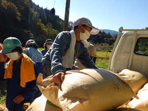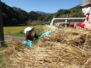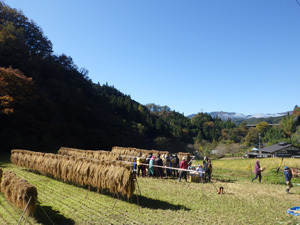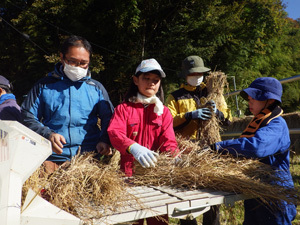 脱穀は地域のおじさんに機械を借りて行いました。機械の力は凄まじく、あっという間に稲からお米の粒が外されていきます。ですがその分とても危険な作業です。絶対にケガしないように集中して作業します。