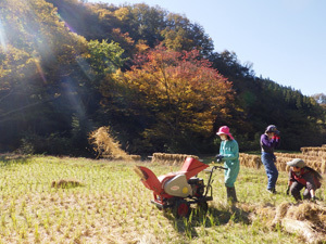 トラックに積みきれなかったわらは、細かくして田んぼに撒きます。一冬おいて、春にまたわらごと耕すと、栄養たっぷりの田んぼになるのです。