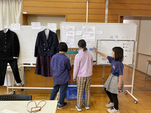 週末こどもたちは東京と名古屋に分かれ出張説明会を行いました。「制服はこっちのほうが見やすいんじゃない?」主催はこどもたちなので、会場に早く入り展示の準備もこどもたちが進めていきます。