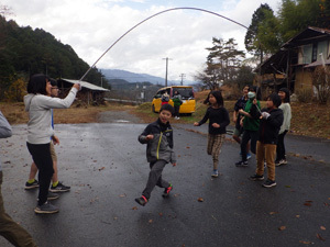 午後は屋外競技で勝負!チームワークが試される大縄をしました。タイミングよく連続で飛び続けられると快感です。