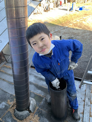 マキは煙突掃除をしています。煙突が詰まってしまうとお風呂がうまく焚けなくなるので重要です。高いところにのぼれるし、普段やらない掃除ということもあり、人気の高い掃除場所なんです。(笑)