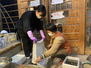 むぎちゃと相談員のなおみちは、種から育てた藍のすくもで染め物をしました。温度調節を常に行いながら、藍の葉っぱを発酵させてできるすくも作りは、ひと手間かかる作業です。どんな色に染まるかワクワクします。