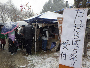 祭り当日は、あいにくの雪でした。それでも低学年の小さな子から、お年寄りの方まで幅広い年齢の方がだいだらぼっちに集まりました!みなさん来ていただきありがとうございました。