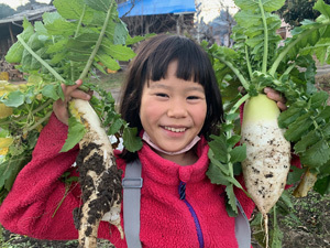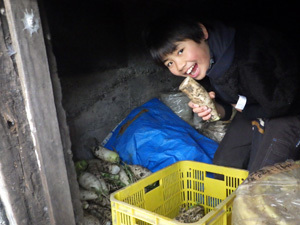 年明けに大根を干して、たくあんを作る予定です。冬休みの間に凍ってしまわないように、収穫した大根は気温が一定の「室」で保存しました。おいしいままで待っててね!