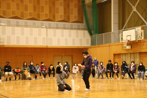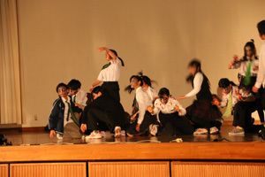 死に物狂いで逃げる人間の緊張感と襲い掛かる大量のゾンビの恐怖を軽快な音楽に合わせて踊る劇のクライマックスです。こどもたちの息をのむ演技は観客をゾンビの世界に引き込みます。