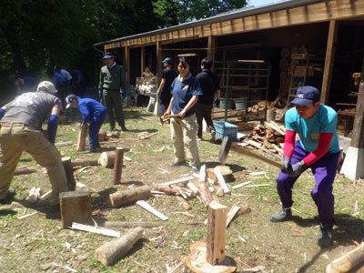 2泊3日のゴールデンウィーク合宿が始まりました!だいだらぼっちではお風呂とストーブに使うたくさんの薪が必要なので、こどもたちの家族も集まって1年分の薪を準備する作業をします。こちらは薪割りチームです。こどもたちに負けずとお父さんも薪を割り続けます!