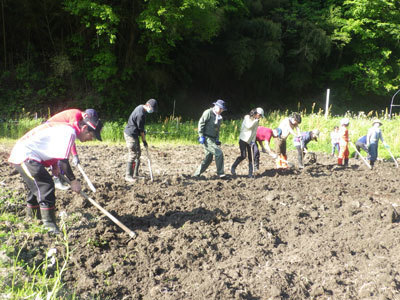 今年は薪作業と同時進行で田んぼでの作業もありました。田植えの前に鍬を使って土と肥料をかき混ぜる田おこしです。広い田んぼを目の前に途方に暮れる作業ですが、たくさんの仲間がいればがんばれます!