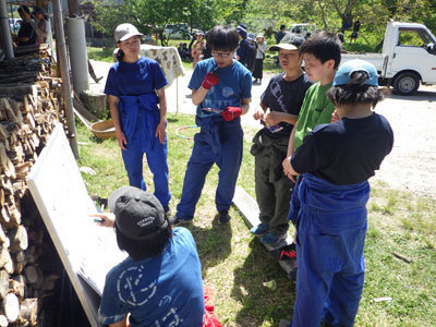 作業の休憩時間に作業隊のこどもたちが集まって話し合っています。色んな場所でチームに分かれて作業をしているので、全体を見る役割がとても大事なのです。作業が進むにつれて刻々変わる状況に合わせて、人の配置、作業内容を考えます!