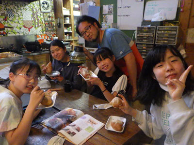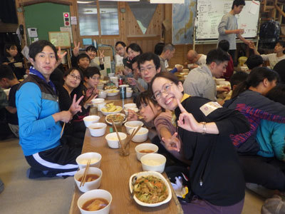 昼ごはんは食事係のこどもたちが作った90人前のスタミナ丼です!作業で疲れた身体においしいごはんが沁み入ります!大人数で食べる「薪割りはどうだった?」「田おこしがこんなに大変だとは!」と話に花が咲きました。