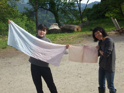 むぎちゃはスタッフのなおみちと毎年やっている染め物。ご近所さんのお庭の八重桜の花びら採らせていただき、発酵させた染液で綺麗なピンク色に染めあげました。半分の青色は昨年染めた藍染でどちらも加熱しない発酵染液(微生物)を使った生きた染め物です。季節を逃さず、身近な自然の力をかりた染め物です。