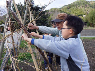 村の方から畑の支柱の立て方を教わる1年目のダイキ。困ったときは自分たちで調べるよりも、村の方から教わることで泰阜での暮らしに合った知恵とコツが学べるのです。