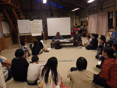 第1回ものづくり教室では、先生のぎっくとまるちゃんから、泰阜の自然の素材を探す、自分の手で生み出すなど、ものづくりで大切なことについて話を聞きました。