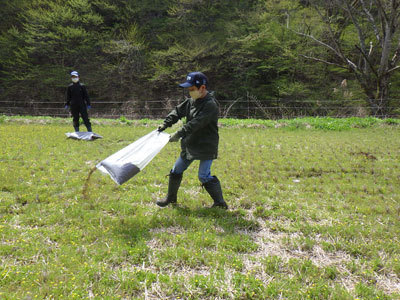水路掃除の後はみんなで田んぼに肥料を撒きました。だいだらぼっちの米作りは土作りから始まります。みんなで分担し散らばって作業したので、1時間で終わりました。