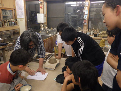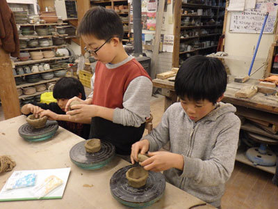 ものづくり教室では、一年目のこどもたちにとって初めての食器づくりが始まりました。手びねりの方法を教えてくれるまるちゃんの話に、みんな興味津々です。