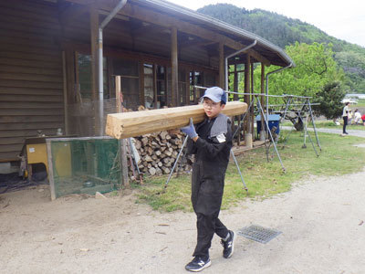ゴールデンウィーク合宿に向けて、薪作業を行う準備をしました。薪を積むために、下に敷く材を黙々と運ぶただっちを見て、他のこどもたちもやる気を出します。
