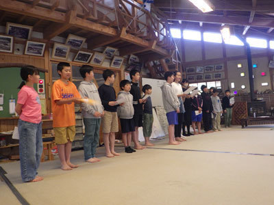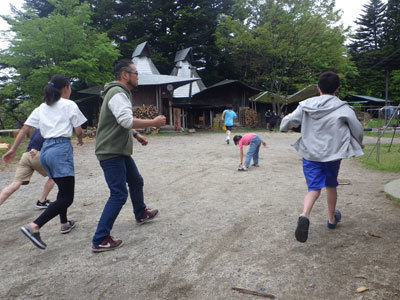 みんなで全力の「だるまさんがころんだ」をしています。でも、ただ遊んでいる訳ではありません。合宿で行うレクリエーションを実際に遊びながら、わかりにくいところやあぶないところを考えているのです。