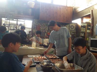合宿中、120人分のご飯を担当する食事係は、本番を前に試作を行いました。来訪者の人数が多いため、今回は揚げない油淋鶏にチャレンジ!おいしくできるか楽しみだね。