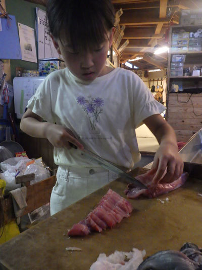 だいだらぼっちに釣りたての新鮮なお魚が届きました!夜ごはんで出すために魚をさばいています。美味しくいただくため表情は真剣です!