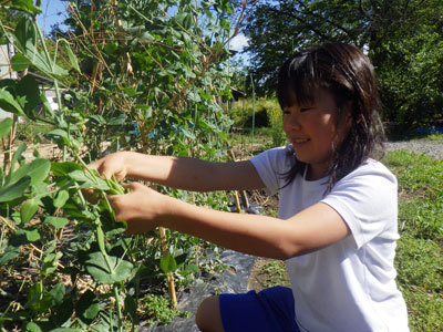 仲っちゃんはスナップエンドウを収穫しています。4月から採れ始めて6月になってもまだ楽しめます。今日は何にしようかな?食卓に並ぶことを想像してワクワクです!