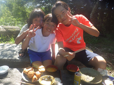運動会が終わると待っていたのは、中学生特製お昼ご飯!涼しい風に吹かれながら、みんなで外でご飯を食べました。中学生の思いのつまったご飯が疲れた体に沁みわたります。