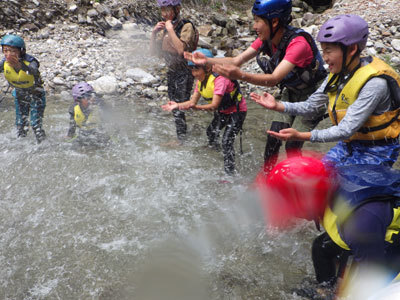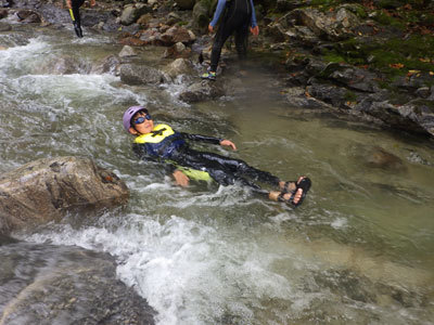 水深は浅く、流れのある万古川では登るだけでなく流れるのがみんなの楽しみ方。川の流れを読みながら、バランスをとって上手に流れます。まるで、天然のウォータースライダーです。
