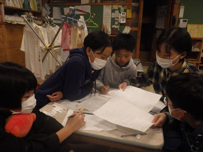 劇の台本作りもいよいよ大詰め。クライマックスのシーンに向けてセリフを考えています。「次のシーンはどうする?!」本番まで時間がないのでこどもたちも必死です。