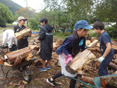 祭りにむけ、山積みになった薪を移動させ敷地内をきれいにしました。「山がなくなってきた!」「あともう少しだ!」みんなで声を掛け合いながら協力して作業しています。