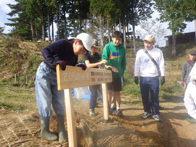 村の公園のゴミ拾いやベンチや看板を設置する作業をお手伝いしました。作業をしながらおしゃべりをして、さまざまな人との交流ができました。