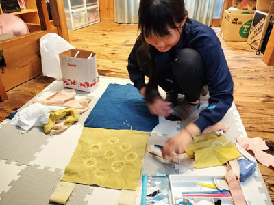 先日染めたマリーゴールドや藍の布を使ってエプロンを作るゆい。こだわりと想い出がつまったオリジナルエプロンです。