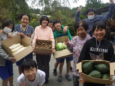 村の方からお野菜をいただきました。たくさんのお野菜に「これで鍋作りたい」と大喜びのこどもたち。作り手と出会うことで、食の楽しみが広がります。